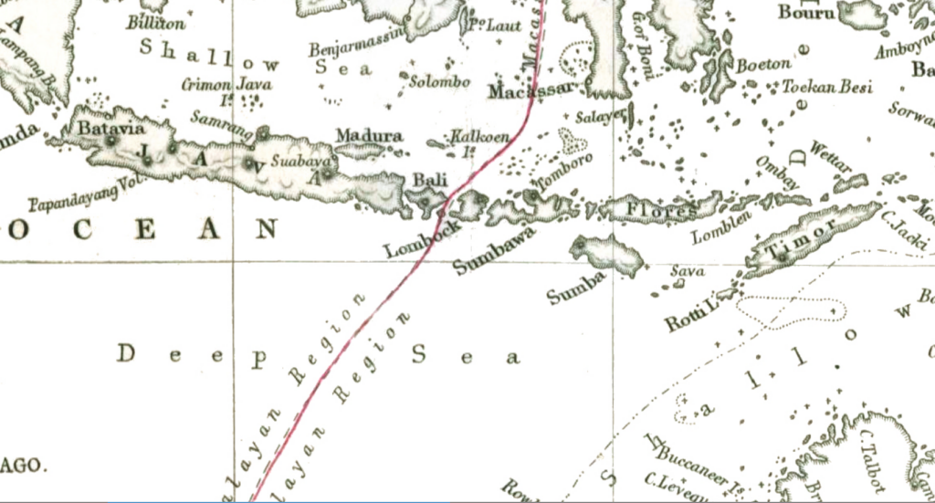 ↑ウォレス線の東側 Flores(フローレス)島の左隣りにコモド島やリンチャ島があります